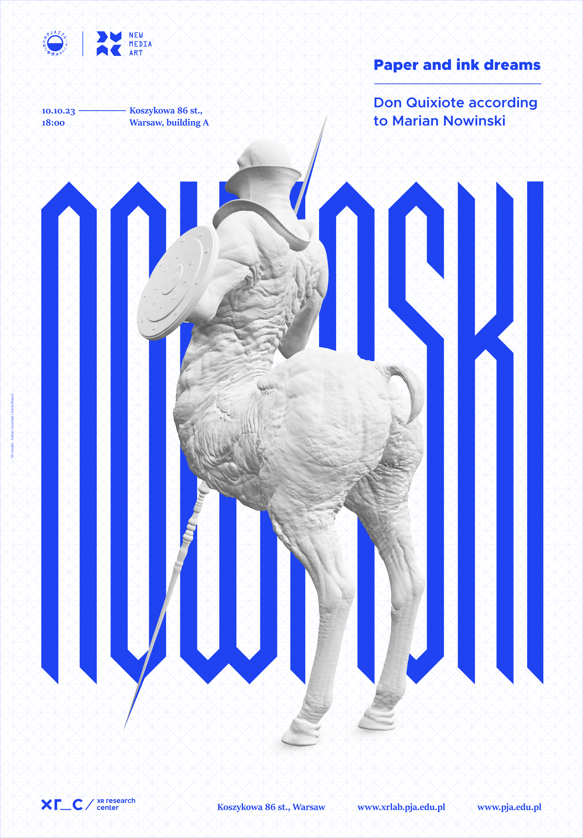 The poster is promoting the exhibitions but also is a form of tribute to the professor whopassed away a few years ago. The main element of the poster is a three-dimensional form reproducing one of the graphics created by Marian Nowinski. 3D model was made by graduates of the department created by the professor, Adrian Szumilas and Karol Klaput. It shows the idea of combining tradition with modernity in visual arts, close to the philosophy of Marian Nowinski. The poster was created on base of the XR_Center PJAIT key visual, also made by the author of the poster.
